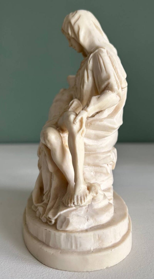 Met oog voor detail is de tedere scène van Maria met de gestorven Christus zorgvuldig tot leven gebracht. De zachte plooien van het gewaad, de serene expressies en de harmonieuze compositie maken dit beeldje tot een verfijnde blikvanger in elke ruimte.