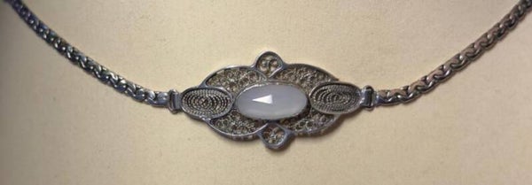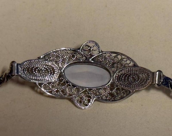 Het middendeel van de armband is prachtig afgewerkt met fijn filigraanwerk en een centrale ovale steen, wat zorgt voor een sierlijke en tijdloze uitstraling. De stevige schakelketting en veerring-sluiting maken de armband comfortabel en veilig om te dragen.
