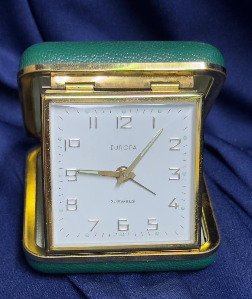 Vintage Europa Reisklok – Mechanisch, Goud met Groene Lederen Behuizing