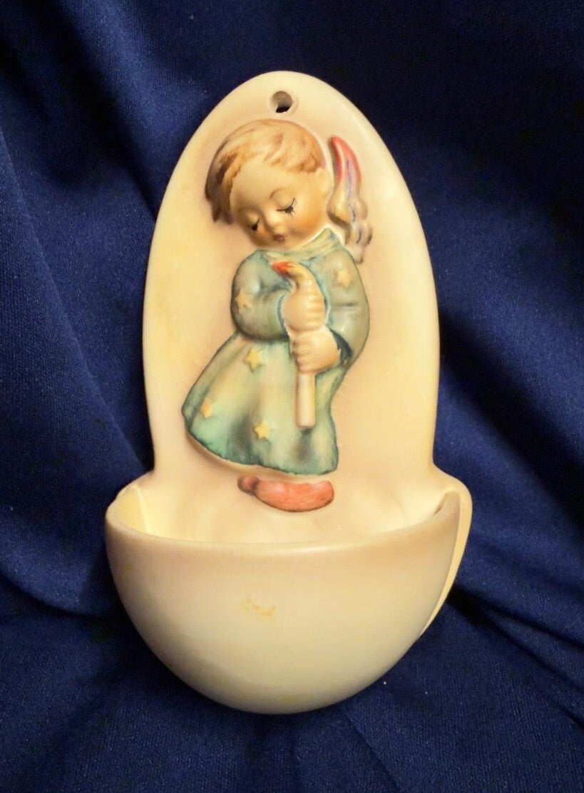 Breng een tijdloze en serene sfeer in huis met dit prachtige vintage wijwaterbakje van keramiek, vervaardigd door het gerenommeerde Goebel in West-Duitsland. Het engeltje, gekleed in een blauwe nachtjapon met delicate gele sterren, houdt liefdevol een kaars vast. Met zijn zachte blonde haar en vredige uitstraling roept het een gevoel van rust en devotie op.