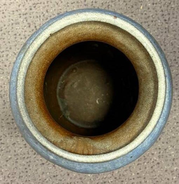De vaas heeft een bijzonder glazuur in aardetinten met een opvallende oranje-rode band in het midden, gecombineerd met blauwgrijze nuances. Dit type glazuur staat ook wel bekend als “fat lava”-stijl, geliefd bij verzamelaars van mid-century design.