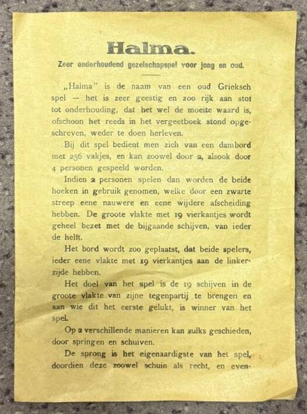 Halma is een strategisch bordspel dat eind 19e eeuw werd uitgevonden en wereldwijd populair werd, ook in de variant Chinese Checkers. Geschikt voor 2 tot 4 spelers.