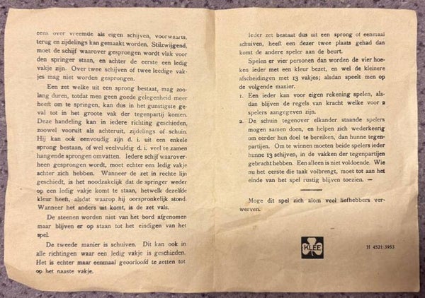 Prachtige vintage Halma speldoos met klassiek stervormig speelbord en pionnen in 4 kleuren (rood, groen, geel en paars). Het spel is compleet en wordt geleverd in de originele doos met vakverdeling én de originele gebruikaanwijzing in oud Nederlands – een bijzonder verzamelitem dat zelden nog aanwezig is.